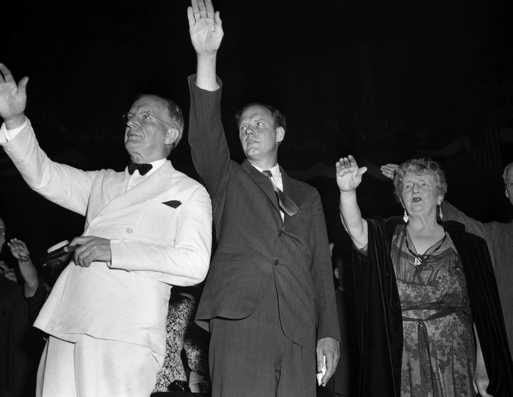NEW YORK, NY -30 OCTOBER 1941: Senator Burton K. Wheeler (1882-1975), Charles Lindbergh (1902-1974) the spokesperson for the America First Committee (AFC) and novelist Kathleen Norris (1880-1966) giving the Nazi arm salute during the rally at Madison Square Garden in New York, New York. The AFC was the pressure group against the Americans joining World War II. (Photo by Irving Haberman/IH Images/Getty Images) (AMF-57)