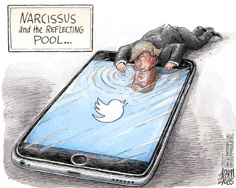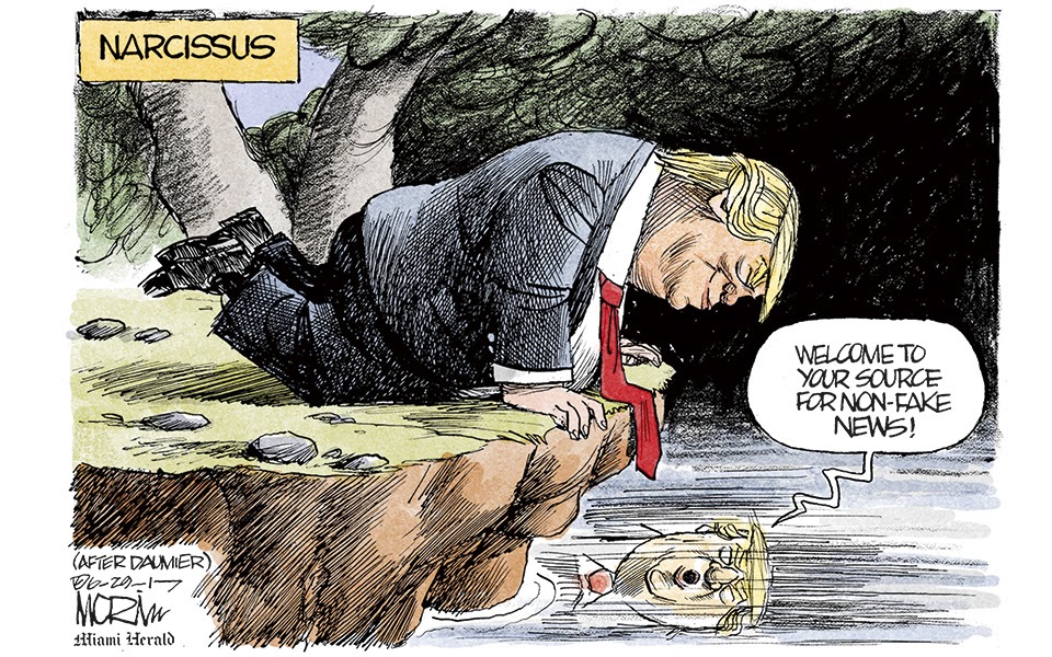 Mr Trump was seriously thinking of a 'Superman' stunt as he left Bethesda the other day. It made me turn to Ovid - not Covid! - and one of his tales: 'The death of Narcissus - In his grief, he ripped the upper border of his clothing and beat his naked chest with hands as white as marble. As he struck, his chest turned rosy red, just like apples, in which some parts are usually red and some are white, or just as unripe grapes in various bunches commonly possess a purple colour. Once he saw his form in the water, he could not endure it a moment longer, but, as yellow wax drips in a tiny flame, as morning frost dissolves in the warm sun, so Narcissus melts away—gradually consumed by hidden fire. And now his face has no more colour … he lacks vitality and strength, those things which, only recently, gave such delight — He cried: “Farewell.” And Echo called: “Farewell!”