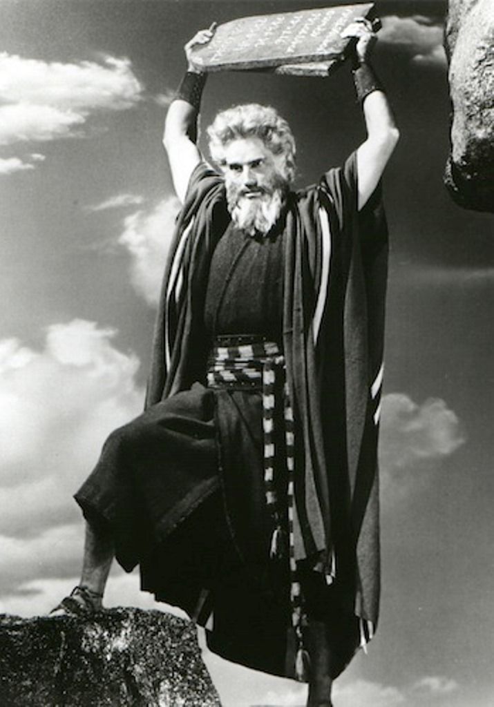 Charlton Heston taking his tablets and breaking them on Mt Sinai. He was a real person but Moses, of course, was a literary invention