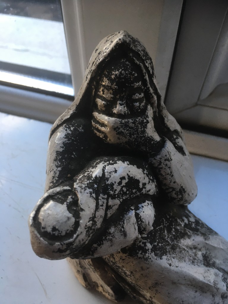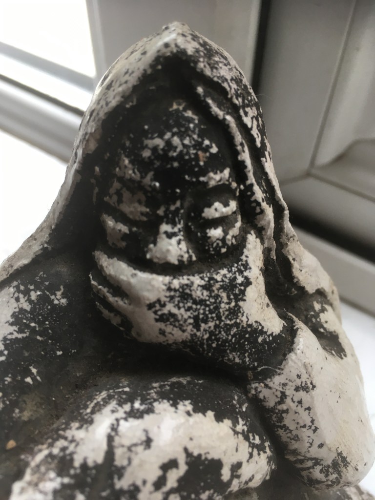 Way back in my early twenties (1970s), I remember a young art student – or her mother- giving my mother this sculpture, as a gift. It was pure white at the time. I cannot recall how it ended up in my possession. I wish I knew the name of the student and what she went on to achieve in her life. Our home was in St James Vicarage, Upper Bangor, NW Wales.